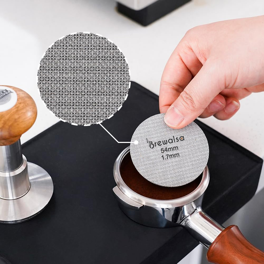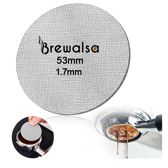 Brewalsa 53mm Espresso Puck Screen Reusable stainless steel filter for 54mm Breville & Delonghi portafilters. Improves water flow, reduces channeling, and enhances flavor.