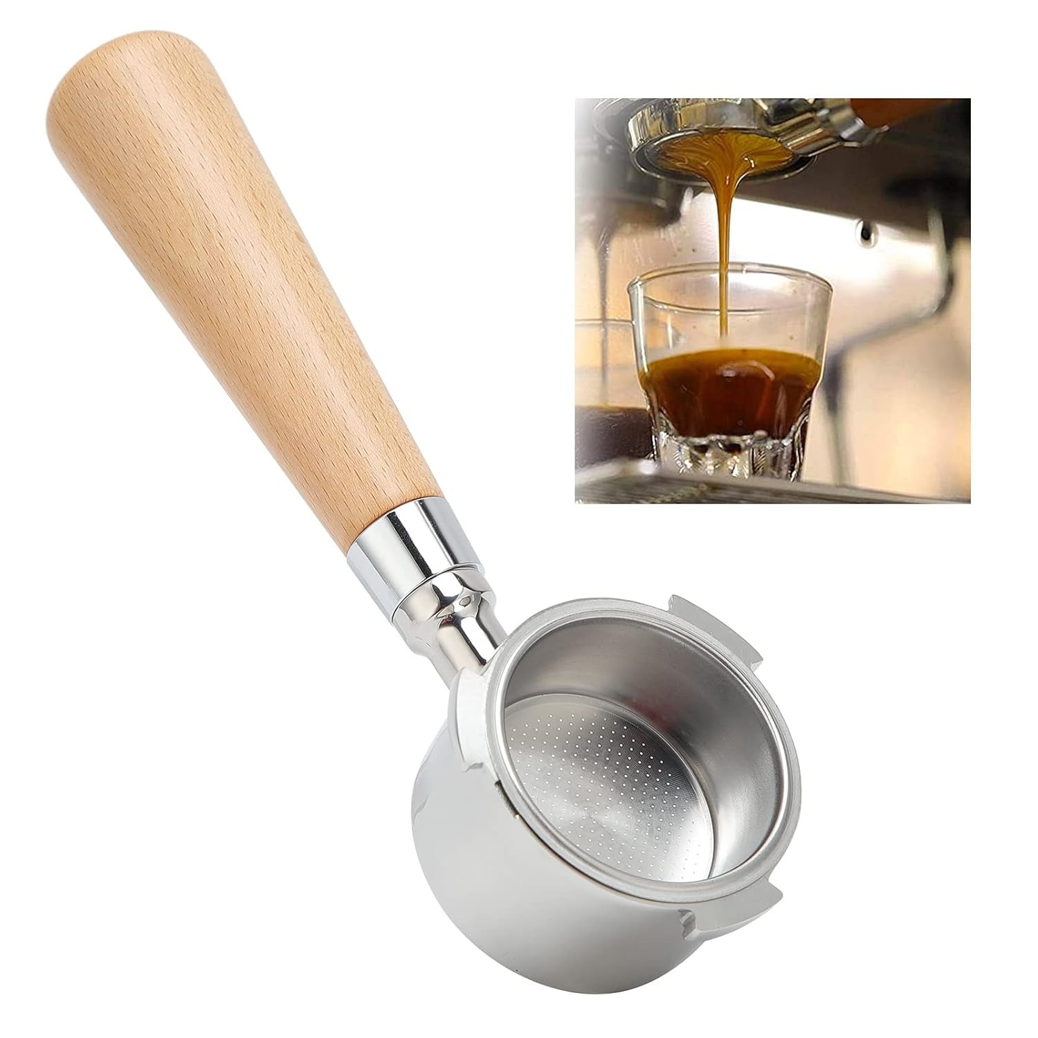 58mm bottomless portafilter with wooden handle and stainless steel head. E61 compatible. Includes 2-cup basket. Ideal for baristas seeking perfect extraction.