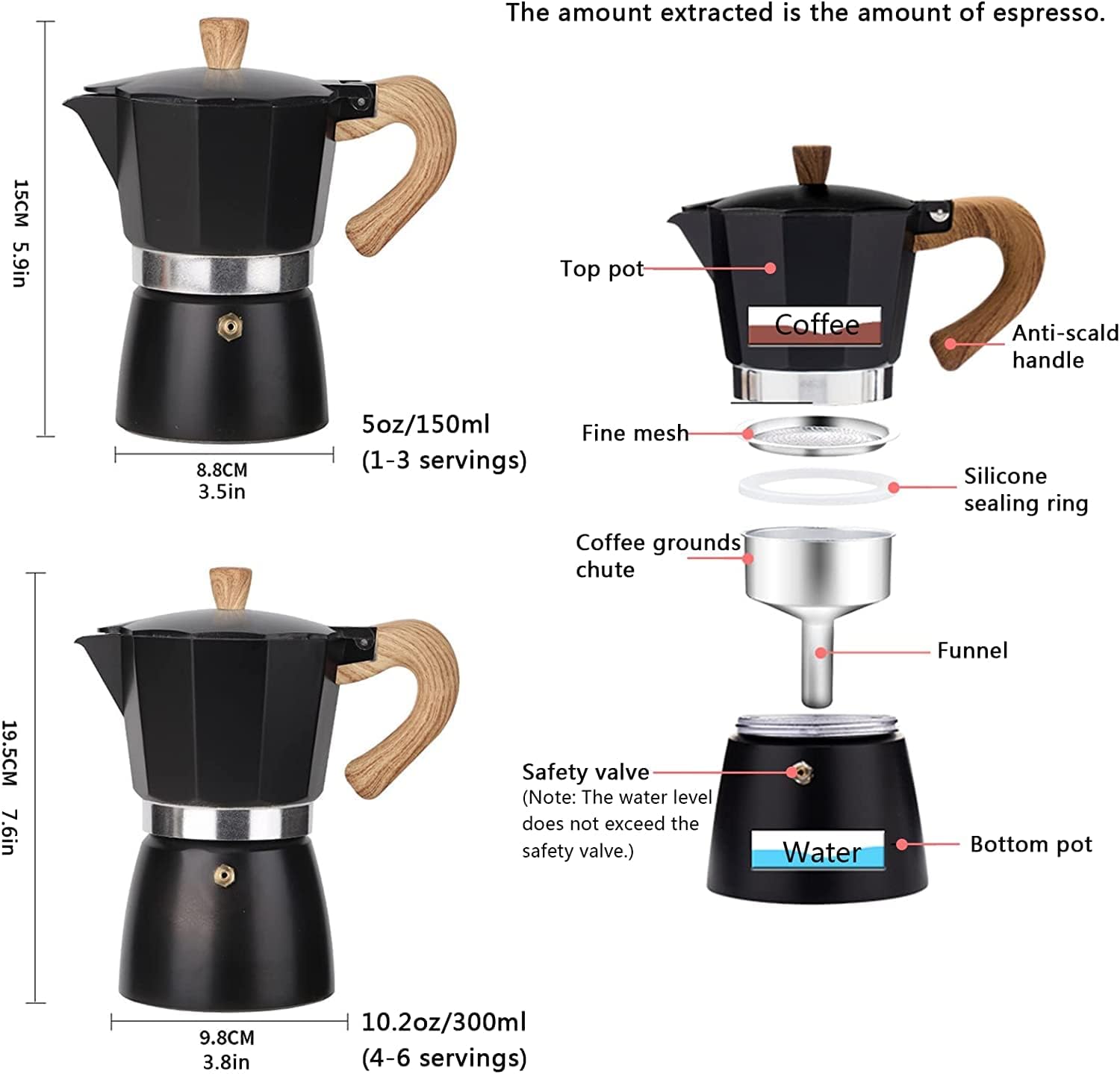 • Classic Moka Design: Traditional brewing method that extracts rich flavors and aromas from your coffee.